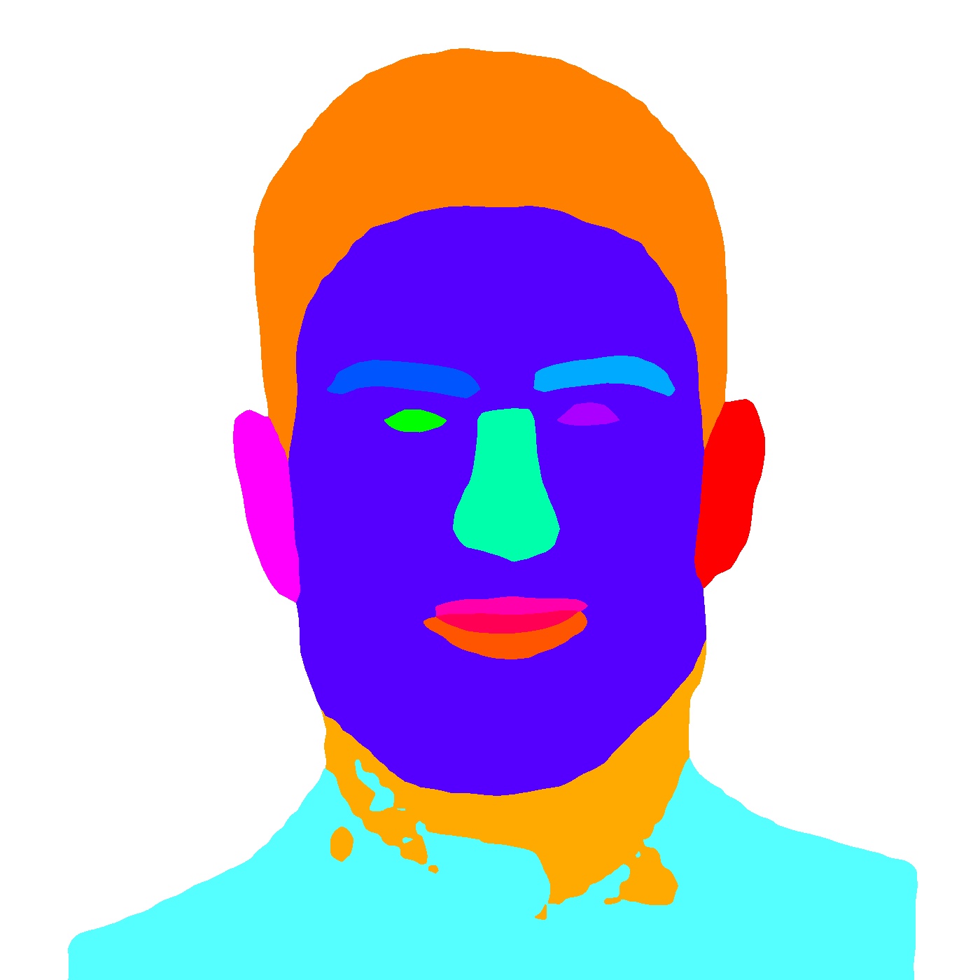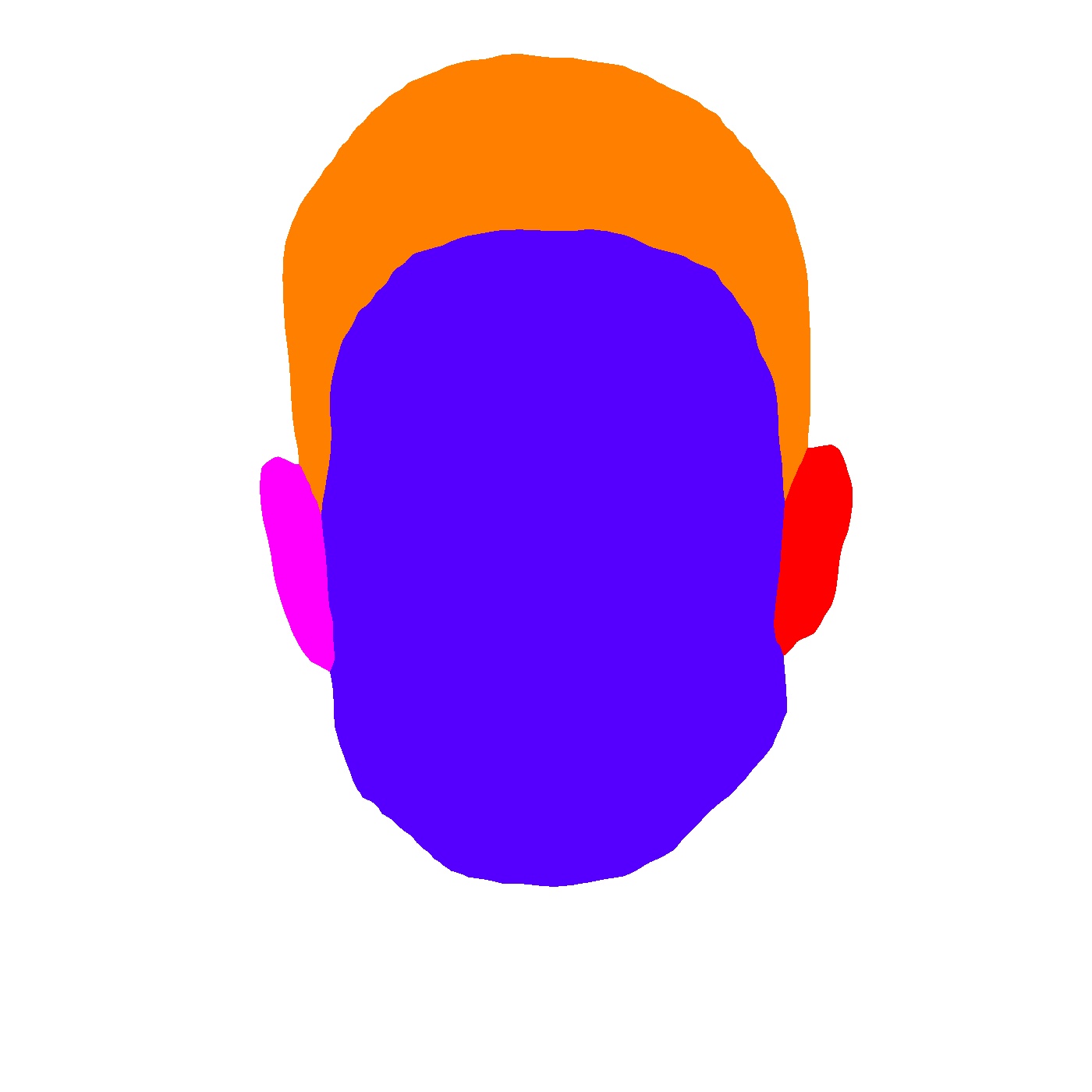 Comme vous l'aurez remarqué, la prédiction concerne 19 zones. Seulement 4 nous intéressent : les oreilles (2), la forme de la tête et les cheveux. Il faut coloriser de la bonne couleur les parties à l'intérieur de la zone bleue et supprimer (mettre en blanc) les zones non souhaitées (cou et vêtement). Une fois que seules les zones souhaitées sont récupérées, nous récupérons uniquement leur contour.